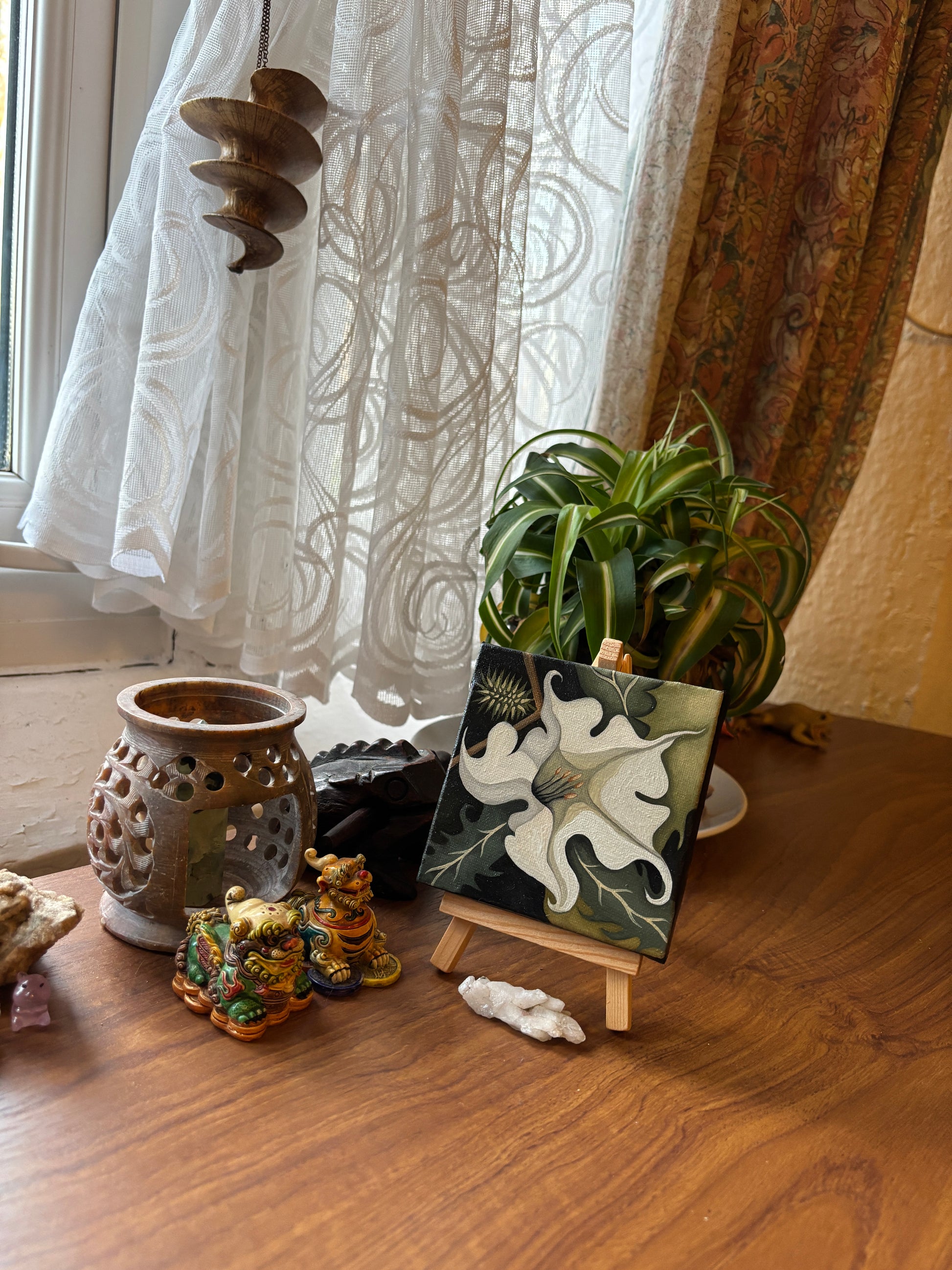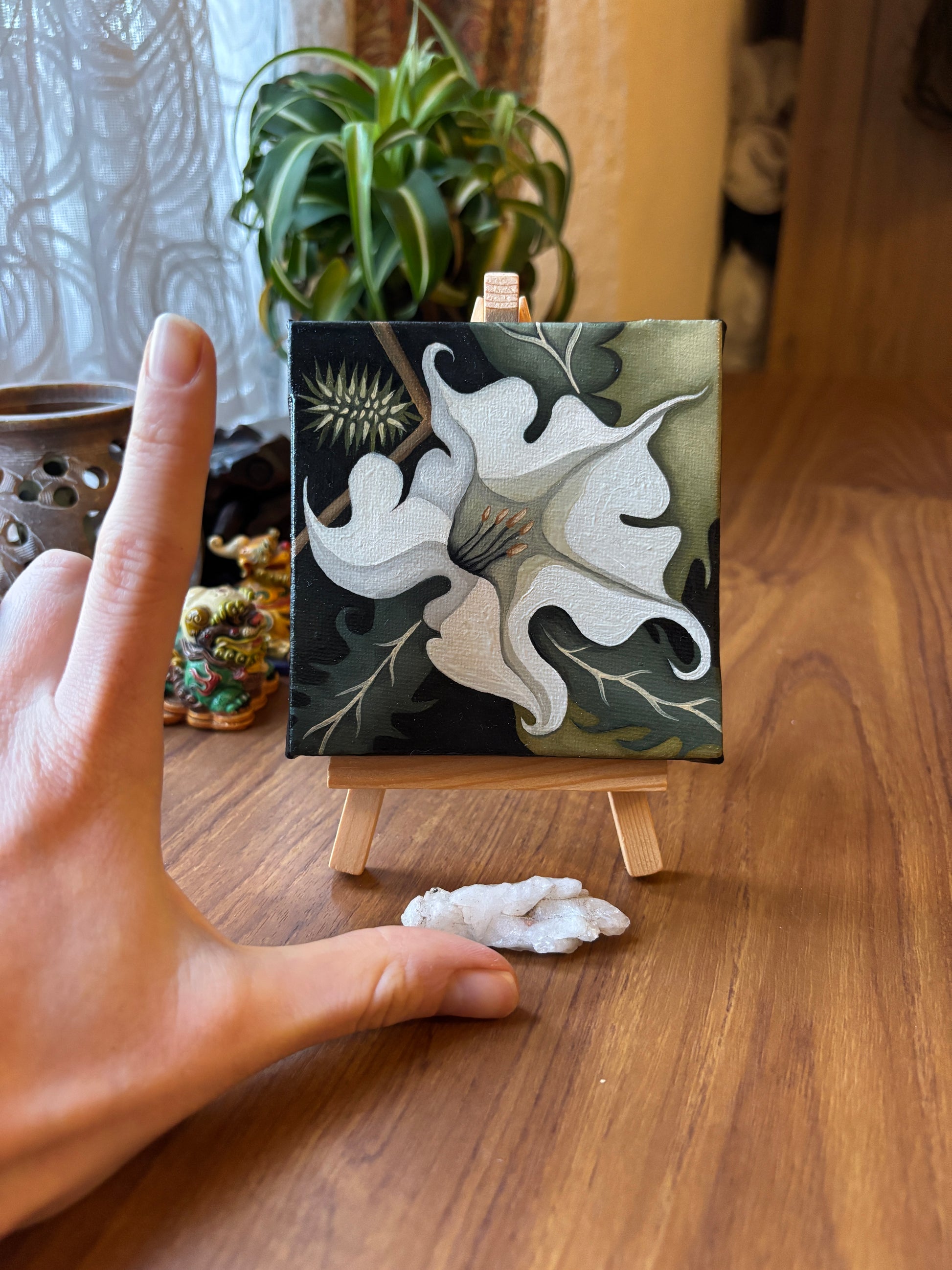 Datura Delirium is a 10 x 10cm miniature oil painting I created in December 2025. I first discovered Datura in 2024, but only a year later have I been unable to stop thinking about it. I’m deeply fascinated by the wild and unsettling trip reports surrounding this plant, experiences unlike anything commonly described with psychedelics. There is something uniquely different about Datura, a presence that feels both alluring and dangerous, and I felt drawn to paint its beautiful flower in celebration of the contrast between its deceptive beauty and the dark trickery beneath the surface.